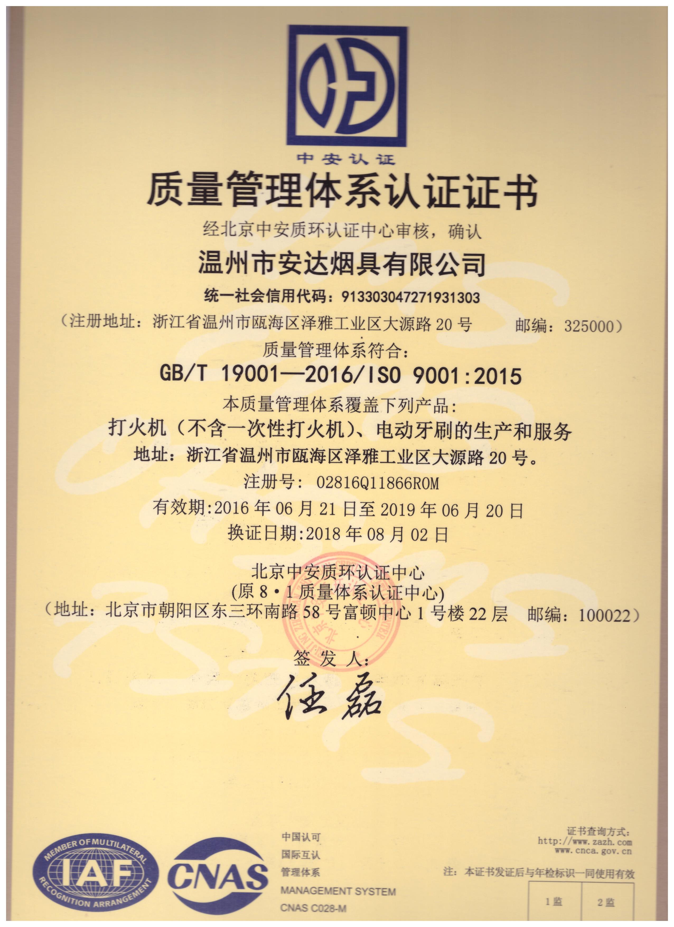 自从2001年连续近20年获得ISO9001质量认证